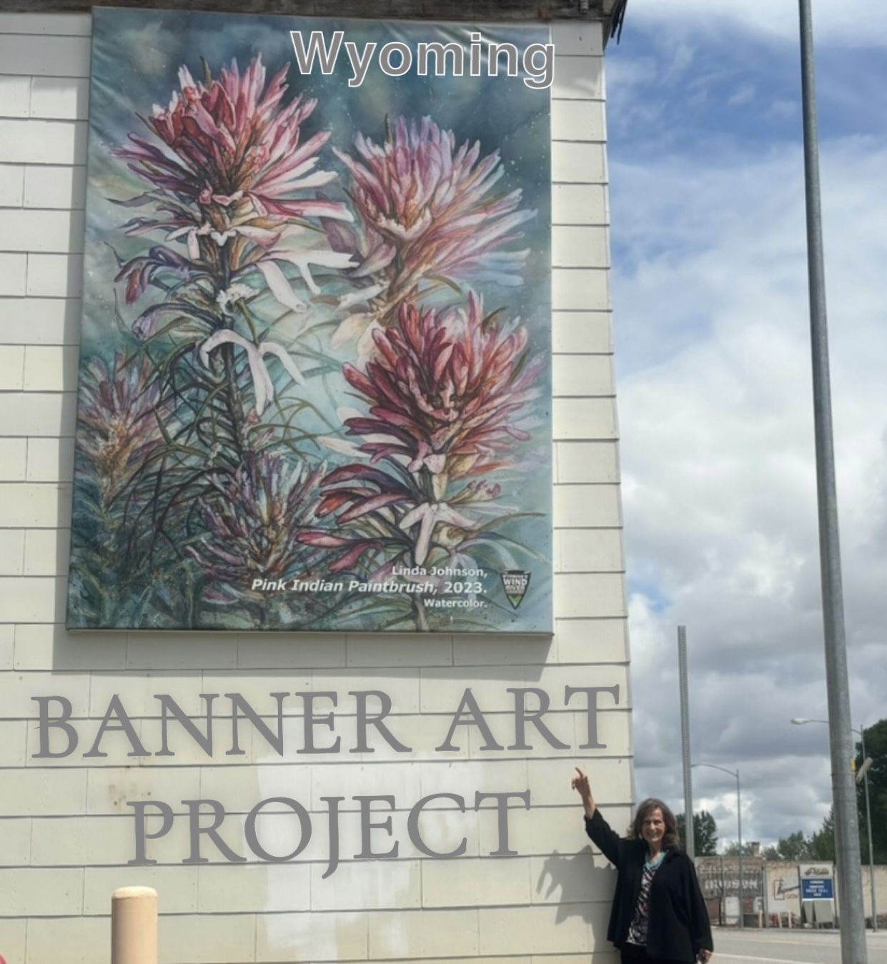 Spring 2024 Linda's watercolor "Pink Indian Paintbrush" was selected by the city to be made into a large banner to be put onto a business building. The Art Banner Project is sponsored by the Wyoming office of Tourism and Wind River Visitors Council. Banners larger than life are installed on buildings to beautify the area.